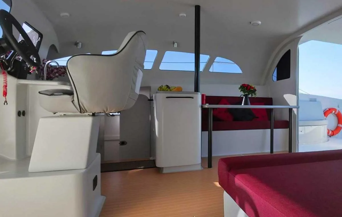Der Power-Katamaran wirkt dank des intelligenten, modernen Designs des großen Open-Air-Salons viel größer als er ist. Er bietet sogar eine Doppelkabine mit Bad sowie bei Bedarf ein Doppelschlafsofa im Salon.